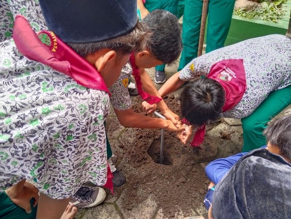 Sementara itu, Pokja Konservasi Air melaksanakan kegiatan pembuatan biopori sebagai solusi sederhana dalam meningkatkan daya resap air tanah dan mengurangi genangan. Murid diajak untuk mempraktikkan langsung proses pembuatan biopori, mulai dari pemilihan lokasi, pengeboran tanah dengan diameter 10–30 cm dan kedalaman sekitar 100 cm, hingga pengisian bahan organik yang akan terurai menjadi kompos alami. Lubang biopori kemudian ditutup dengan penutup berpori untuk menjaga fungsinya tetap optimal.